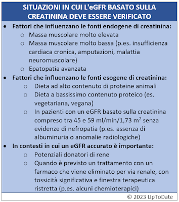 Alcuni farmaci interferiscono con la secrezione tubulare della creatinina (trimetoprim, cimetidina, fenofibrato) e possono causare una stima della VFG falsamente bassa.